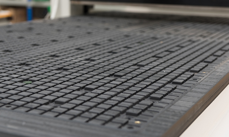 雙層真空吸附臺面,臺面結構為分為上下兩層,中間帶儲氣室,臺面有128個及以上的吸附孔。加工時板件固定,一是靠真空泵的吸力,二是靠真空泵抽空臺面氣室內(nèi)的氣體,造成低壓氣室,然后通過大氣壓強來壓住板件,讓板件不輕易滑動。是目前主流的數(shù)控開料機臺面結構。并且加工小板比較小,或者工件透氣性很好,可以選擇給機器加配壓輪,以達到更好的加工效果。